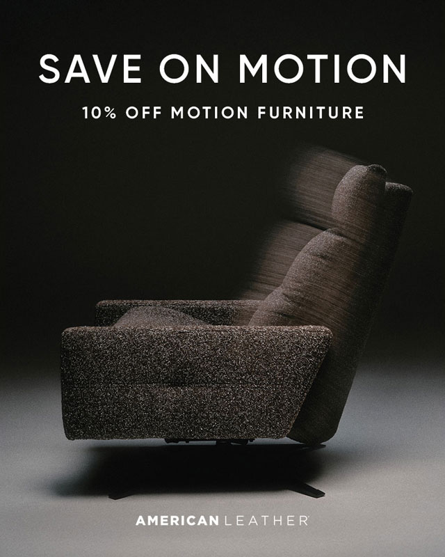 From now through February 24th, SAVE 10% on all Motion seating by American Leather for In-stock or Special Orders. Motion products include the M-Series, Re-Invented Recliners, Comfort Air, Comfort Echo, Comfort Relax, Comfort Solace, Classic Recliners and Comfort Theatre. Take advantage of great pricing during this Sale Event on American Made Products.