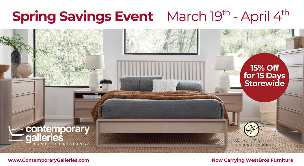 Spring is just around the corner and to celebrate we are providing a 15% Discount for 15 Days. This discount is on all items Storewide except Everyday Value Items or Clearance Items. This 15% Discount is good on In-stock Items as well as Special Orders. Hurry as this is a limited time opportunity to save on your favorite furniture from Contemporary Galleries. For 2026 we have added many new items on our showroom as well as new brands like IMG Comfort and West Bros Furniture.