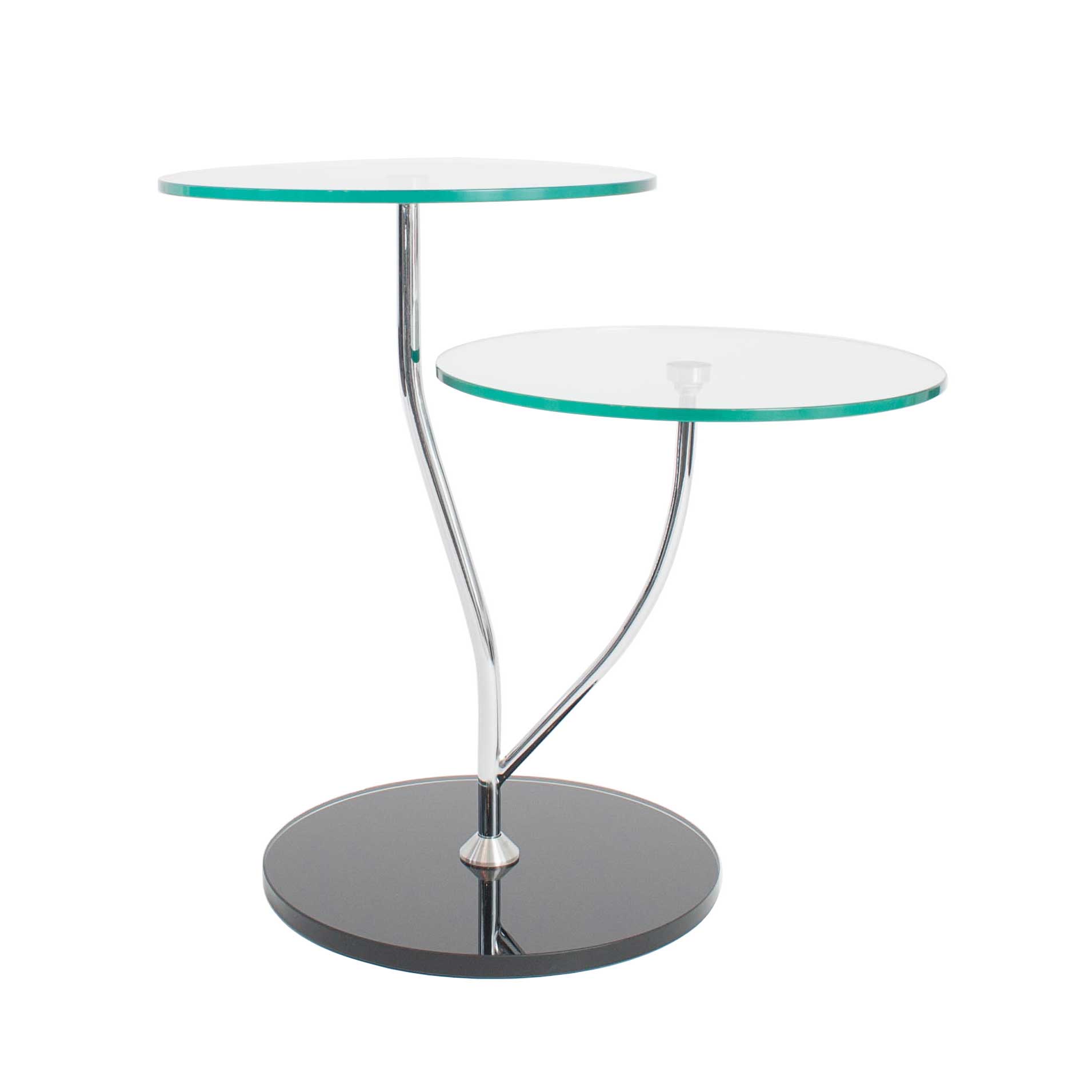 10mm thick clear glass tops & black glass base All glass is tempered for safety Polished chrome plated metal arms & center post Two tiers of glass tops that are 16″ diameter each