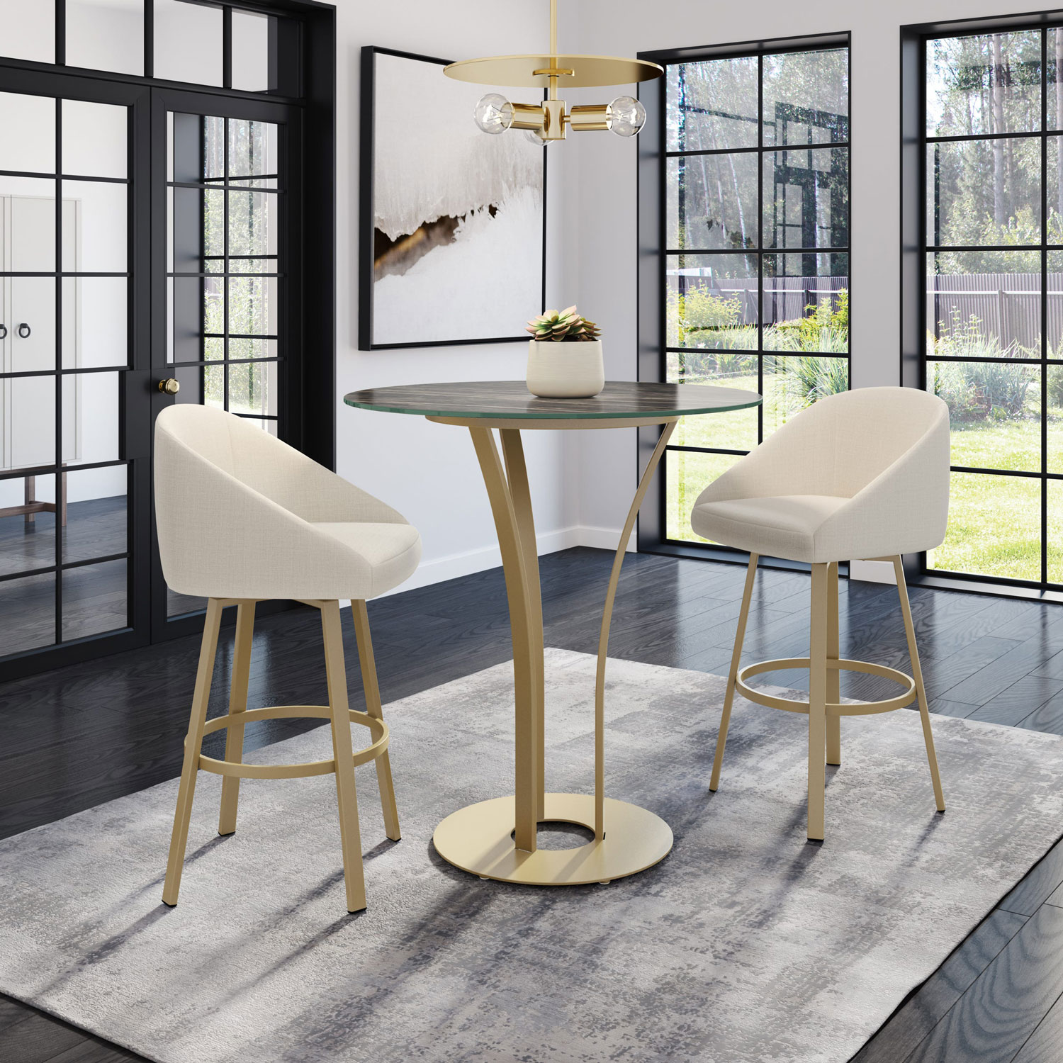 Its charm and character emanate from its base with its mix of slanted angles and modern geometric lines. Top has the look & texture of stone with a slight sheen on the surface Top is stain, scratch, water resistant & is easy to maintain One piece metal base has a durable powder coat finish For use with 24"-26" seat height counter stools Stocked with Magnetite metal finish & Lava Starstone top Available in other finishes, sizes & materials by special order 48" Diameter 36" Height