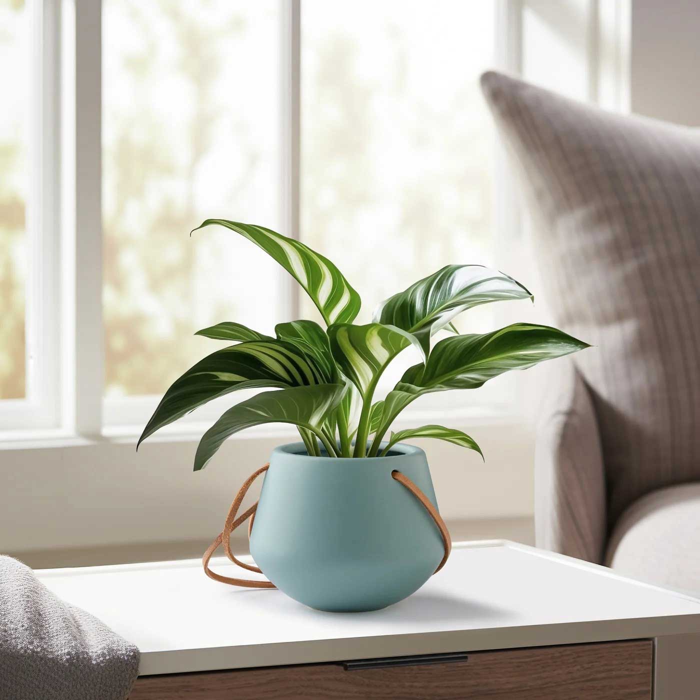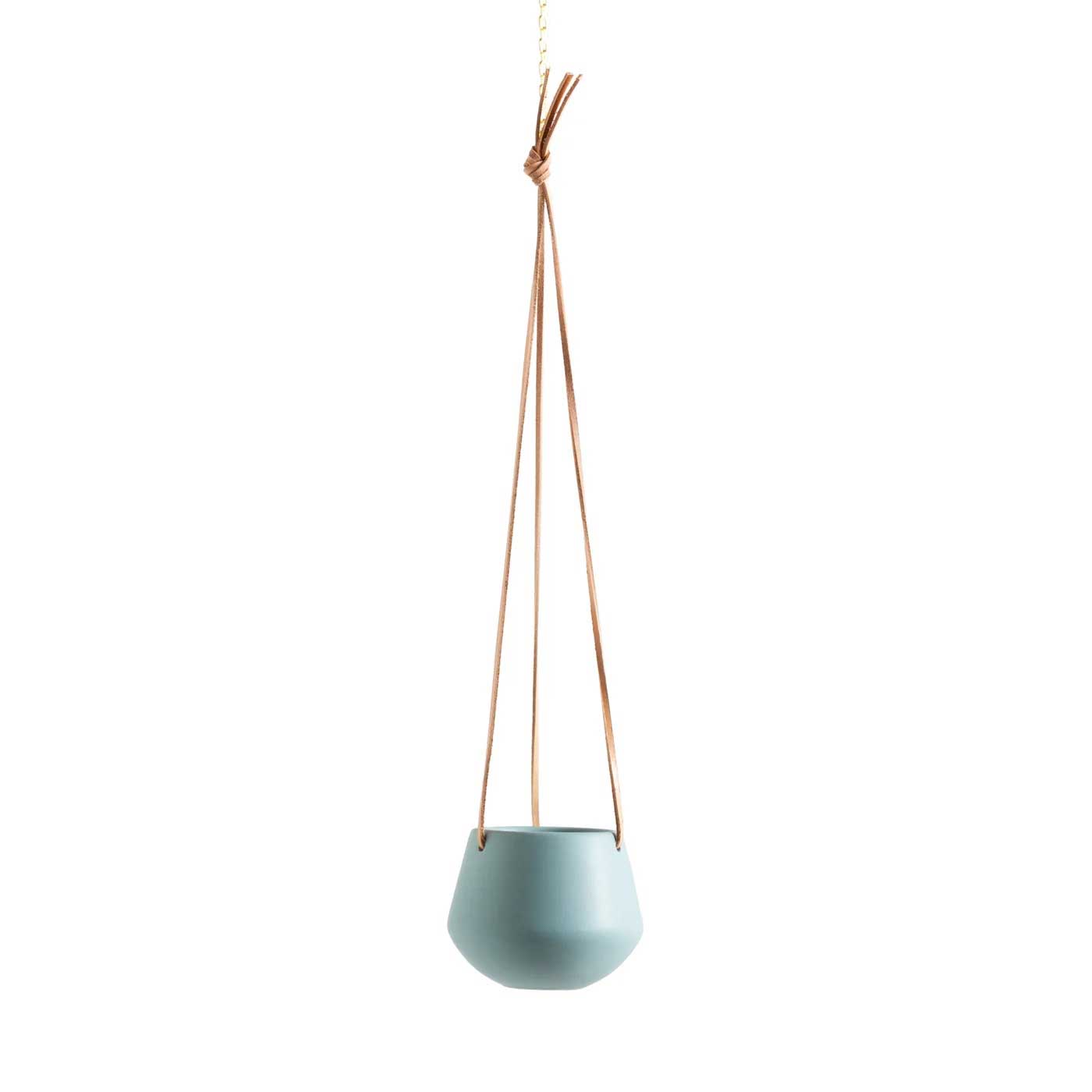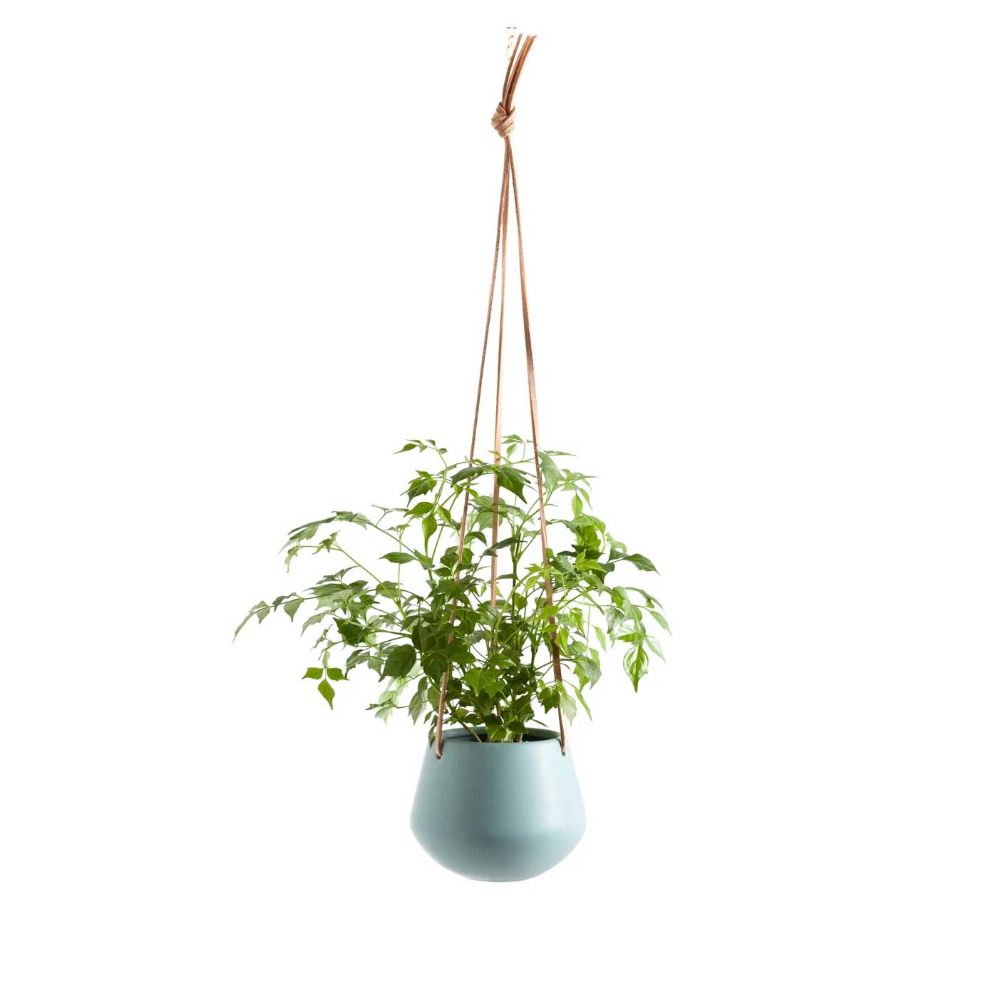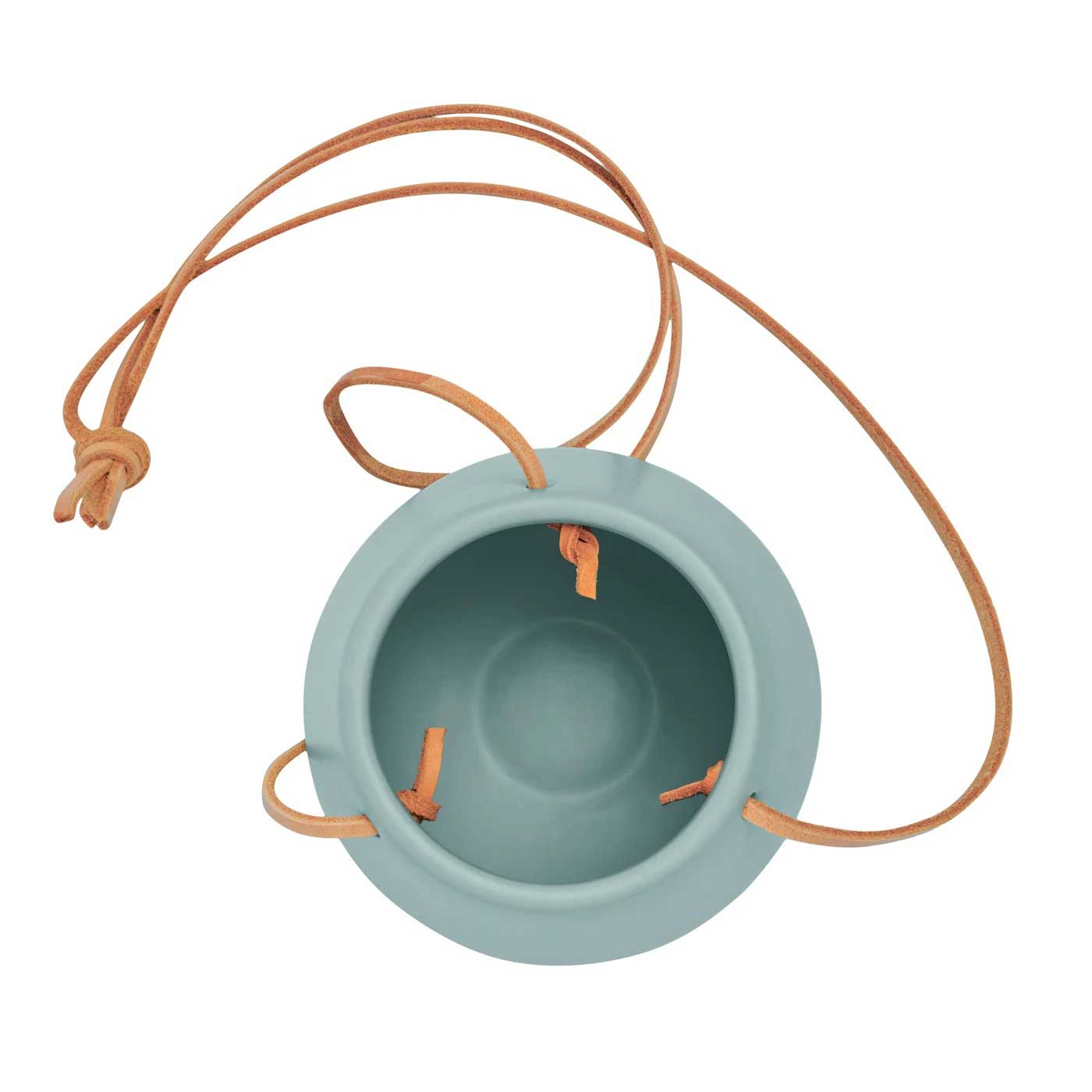 Teal ceramic pot with leather hanging cords