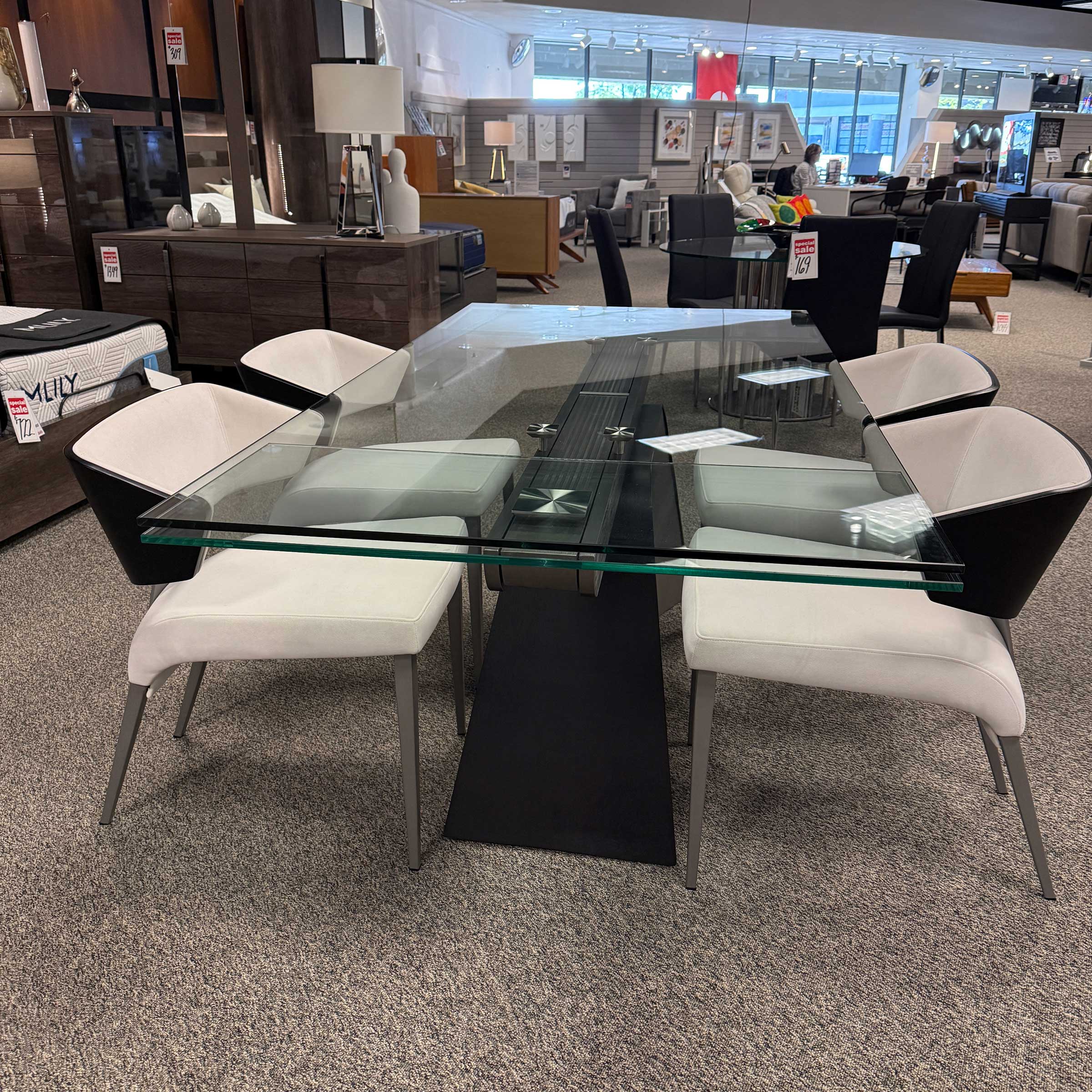 Great table for smaller eating areas that easily expands from 47" to 63" Starphire white tempered glass top & leaf White lacquered support column with a brushed stainless steel base Hidden butterfly leaf stores inside the table when not in use Locks hidden under the table top to keep table sections taunt Release lock & then simply pull outward from the table end & the leaf raises in place To remove leaf, simply pull slightly outward then push inwards & leaf will disappear from site Sits 4-6 people 47"-63" Length 31" Width 30" Height