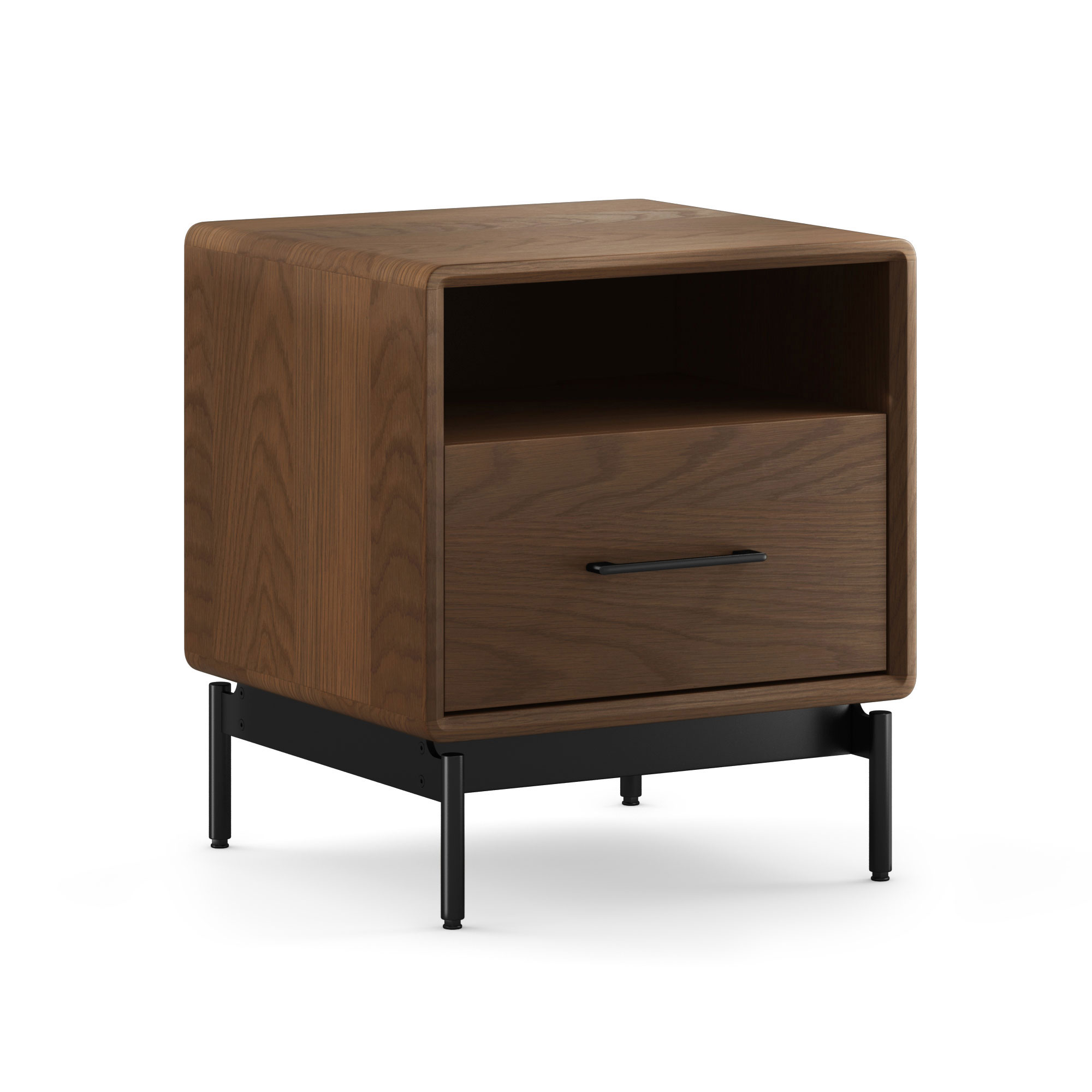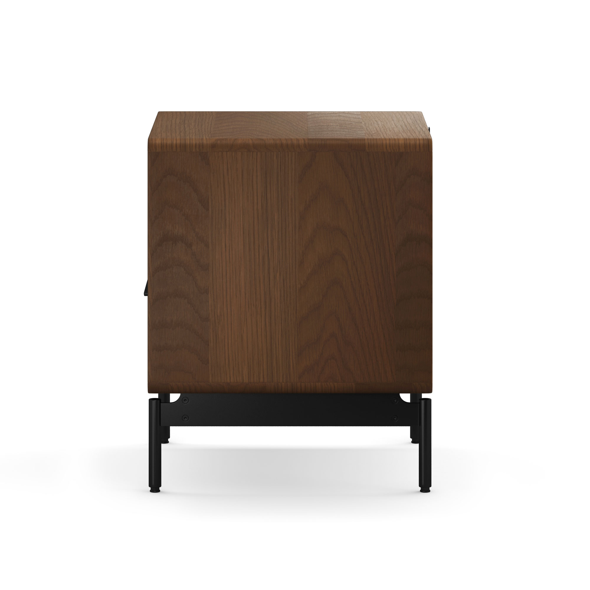 Stained oak solids & veneers ensures each item is a unique work of nature Soft, gentle curved top & bottom corners enhance this beautiful design Interlock drawer system only allows one drawer to open at a time for safety Hidden drawer glides for a clean modern appearance Drawers are self-closing with a gentle push Each drawer can hold 25lbs Wire wraps are attached on the back of the chest to control cords Cabinet attaches to a black matte finished raised metal base Designed by Matthew Weatherly Showroom model closeout 35" Width 20" Depth 51" Height