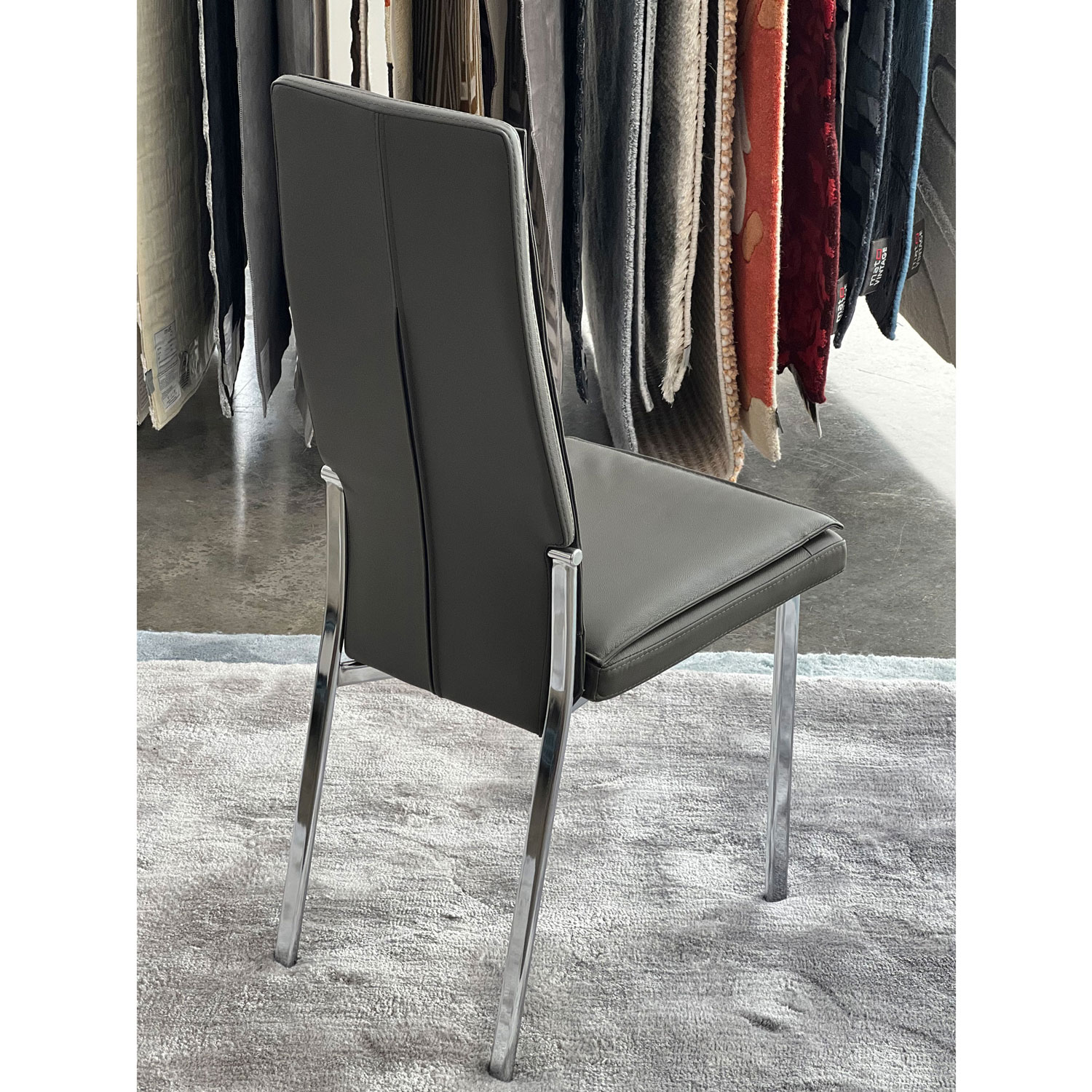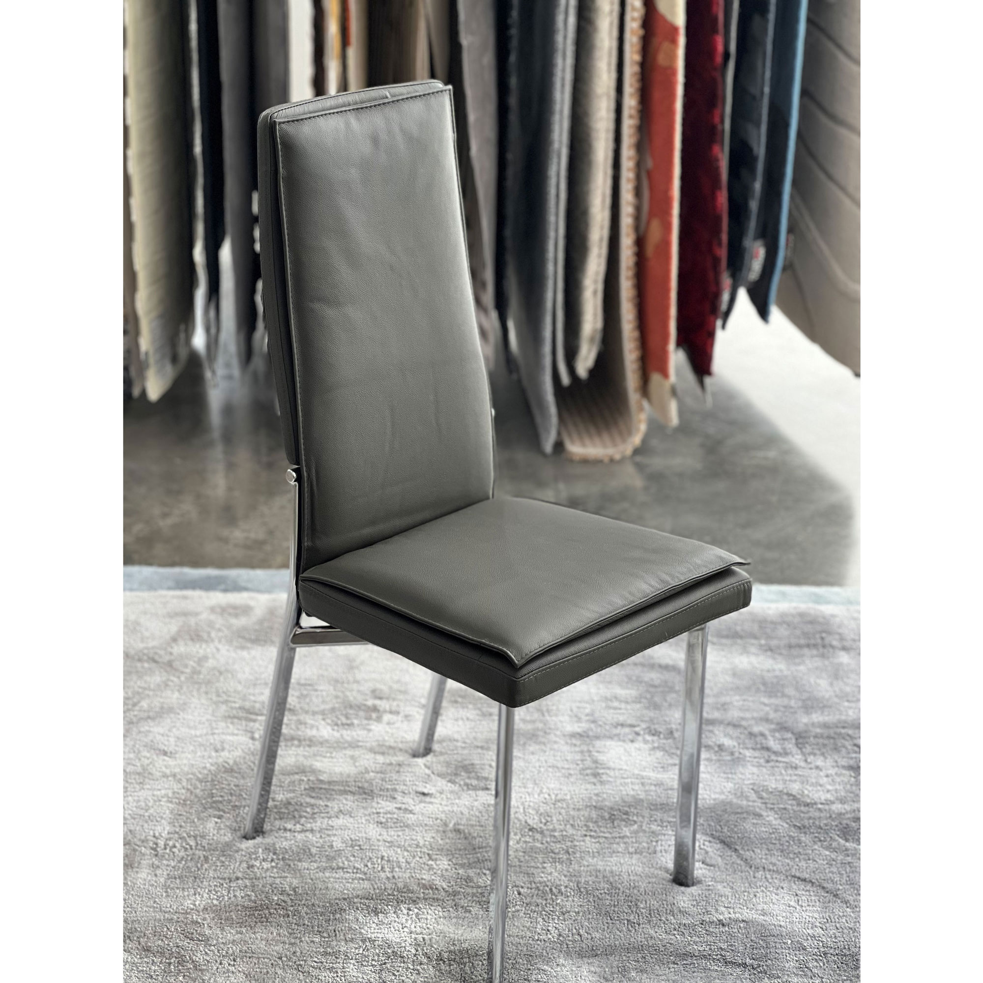 Comfortable padded seat & back in a 100% polyester fabric Sturdy one piece frame construction Back rest floats upon 2 vertical supports Stocked in Sleet upholstery with a Metallo frame finish Many finishes & materials are available Made in Canada 18" Width 22" Depth 32" Height