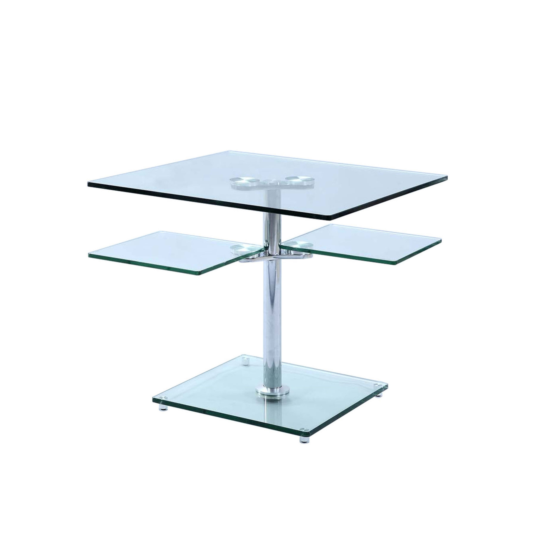 1/2" thick clear tempered glass with safety corners Polished chrome metal support pillars Pivots from square to rectangle 2 Middle shelves are 31.5" x 17" each Center shelves are 10.5" & 12" high Table is 31.5" square closed 31.5" Width 31.5" Length Closed 50" Length Open 16.5" Height