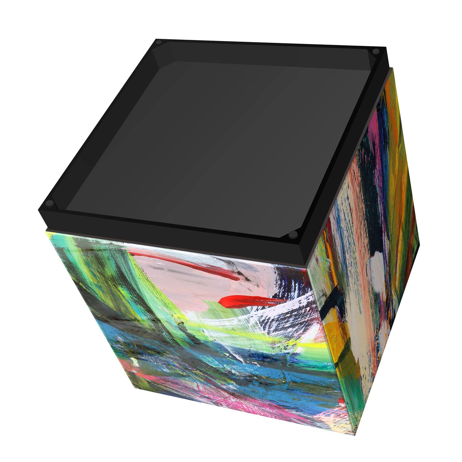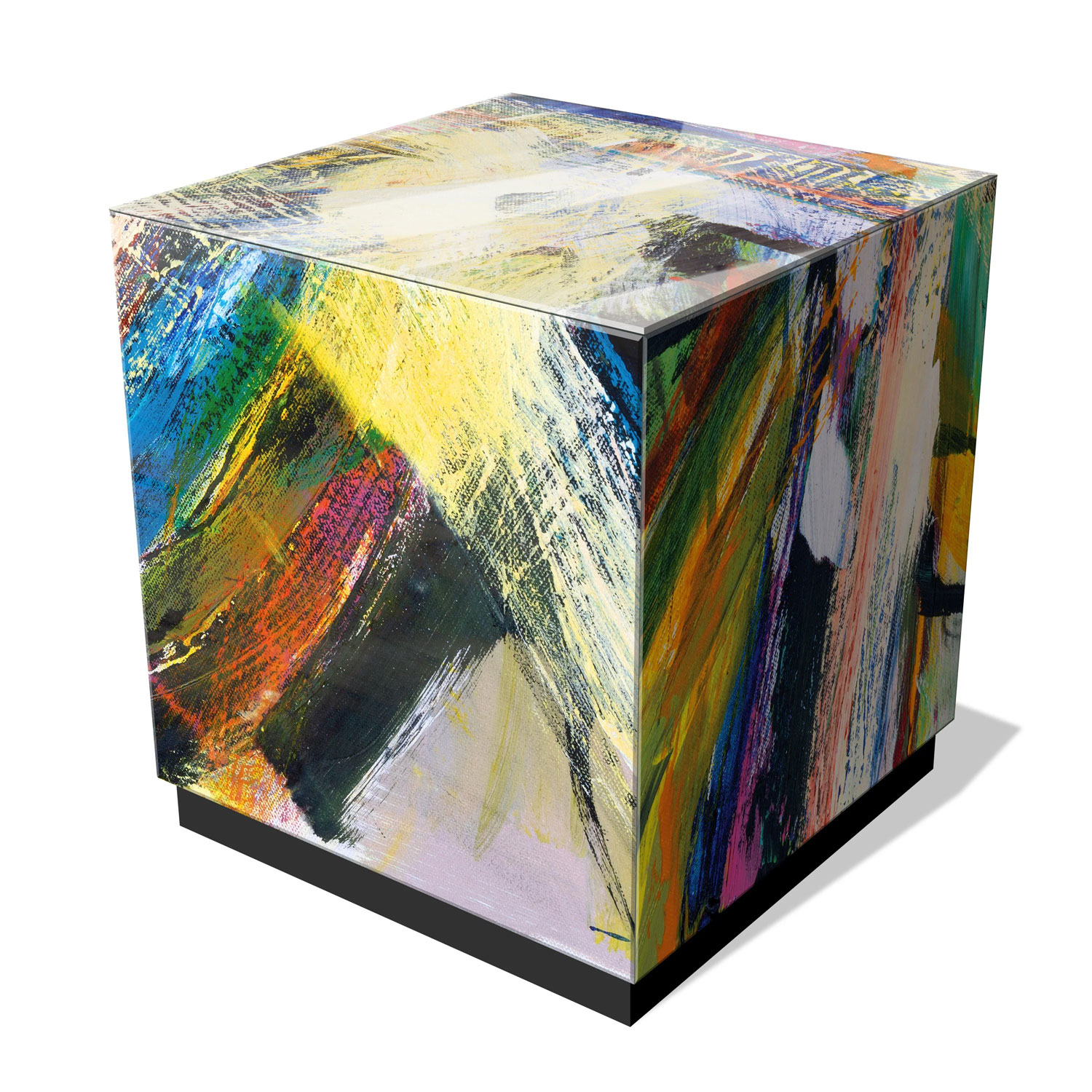 Each piece is unique Reverse printed beveled art glass Black plinth base Bold, colorful & textural thick brushed strokes ARTIST: Jodi Fuchs
