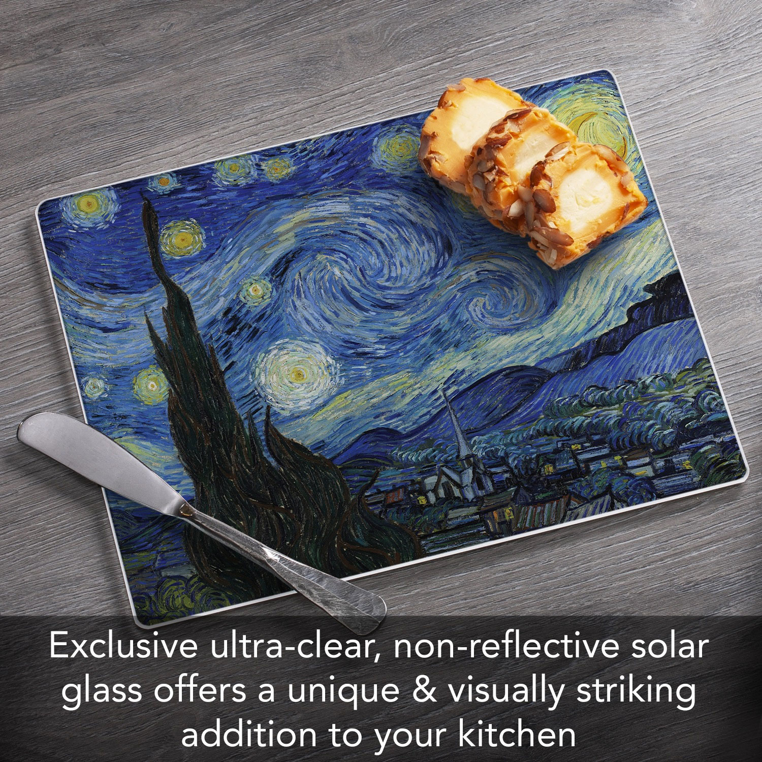 Fun Starry Night art printed within the cutting board