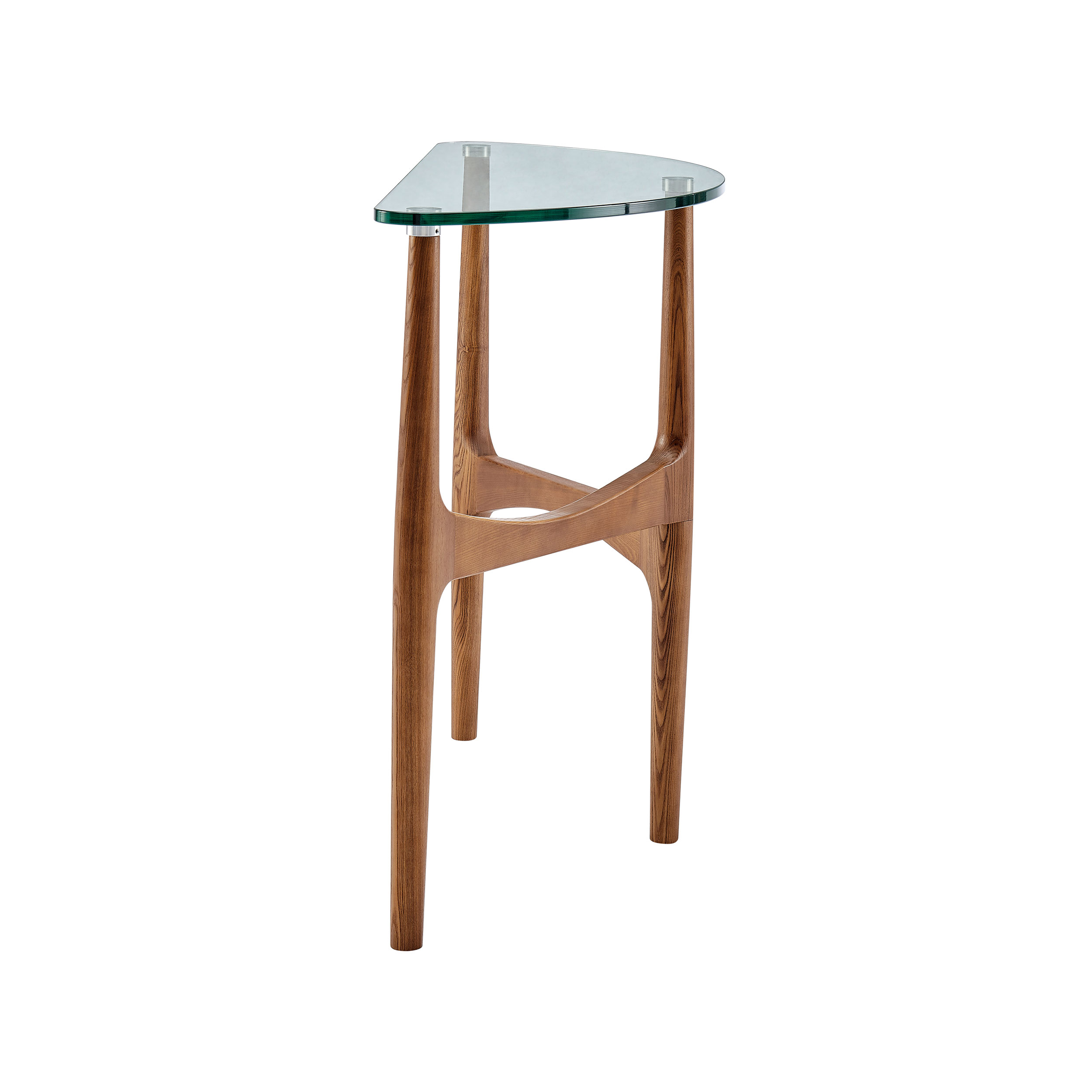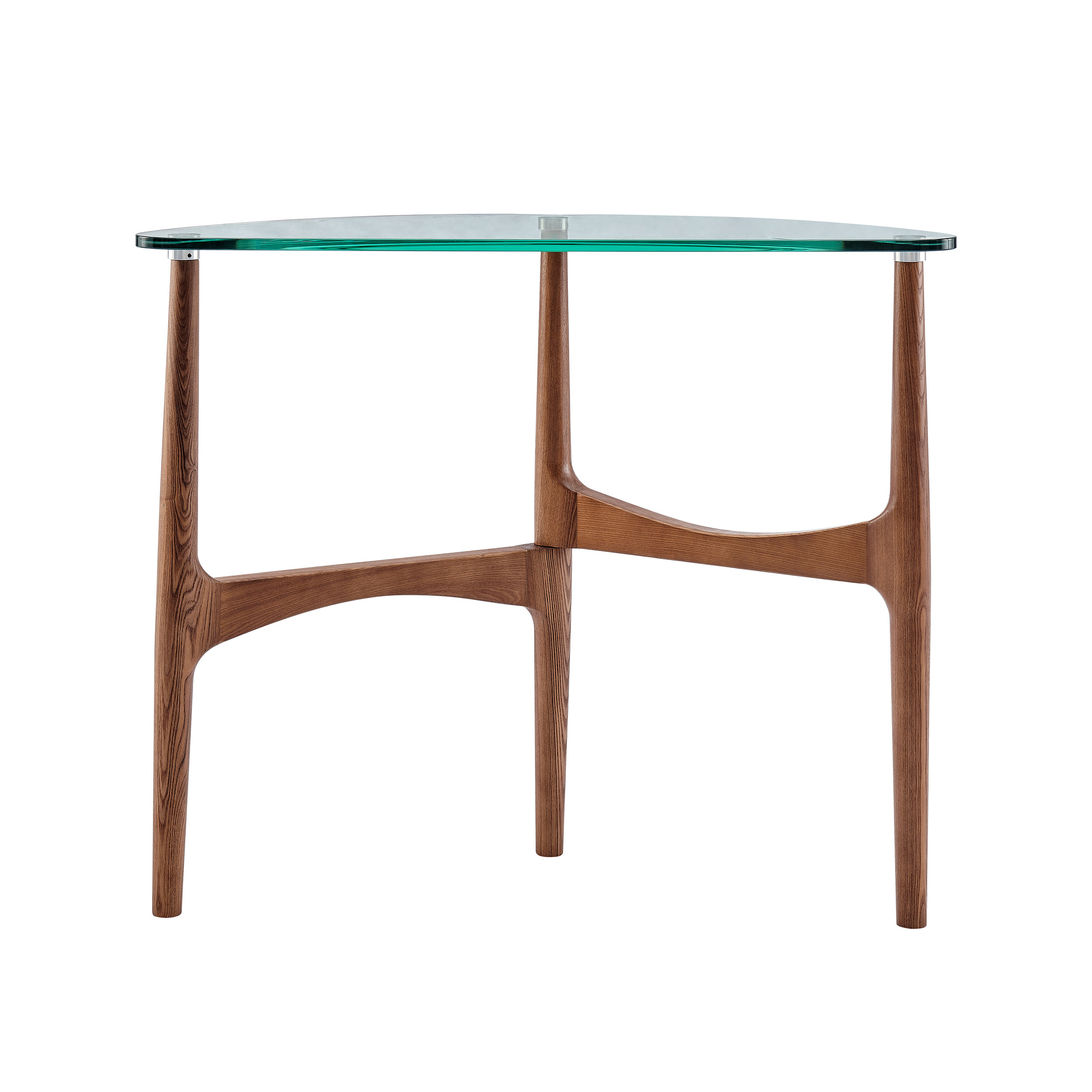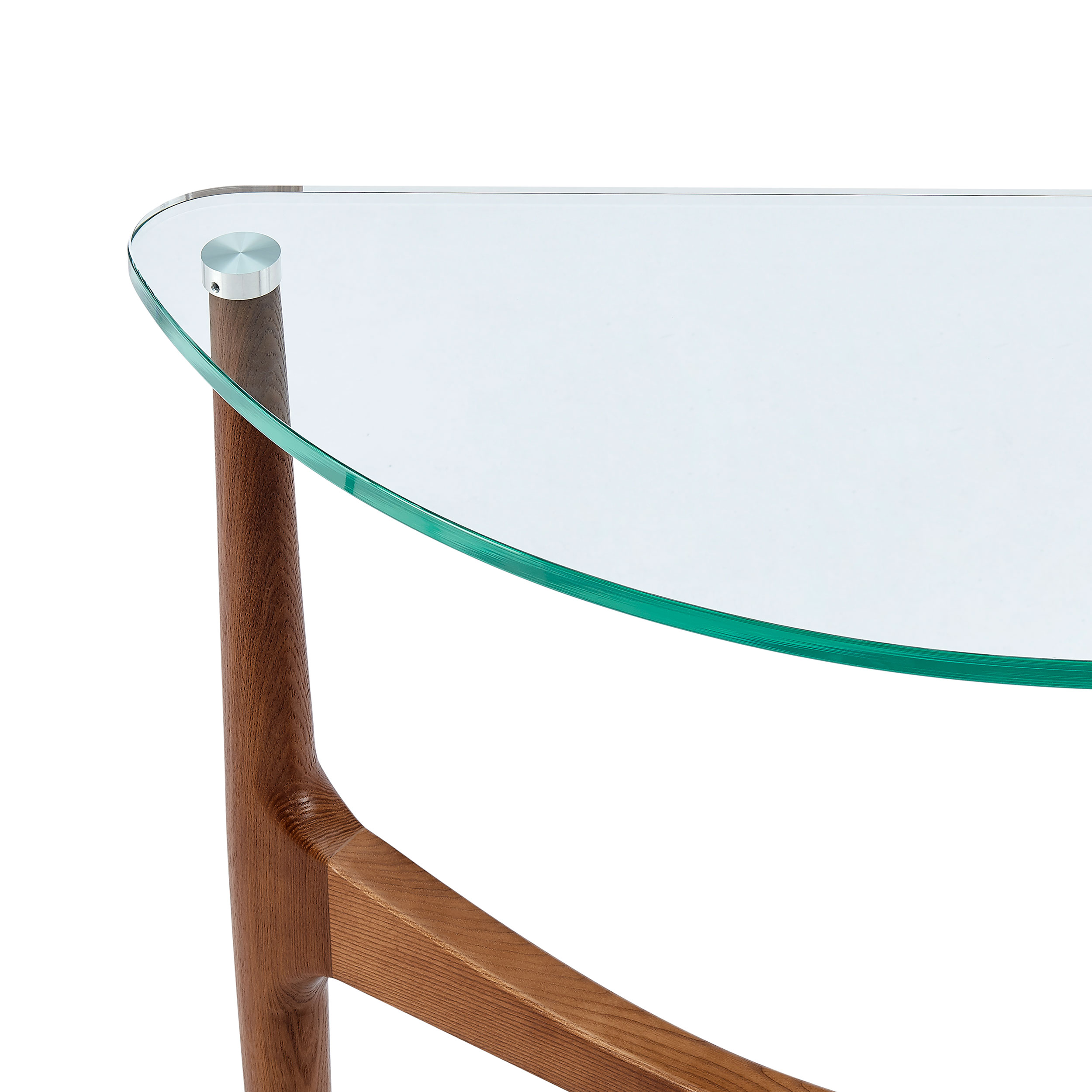Stainless steel caps on the wood base where glass attaches
