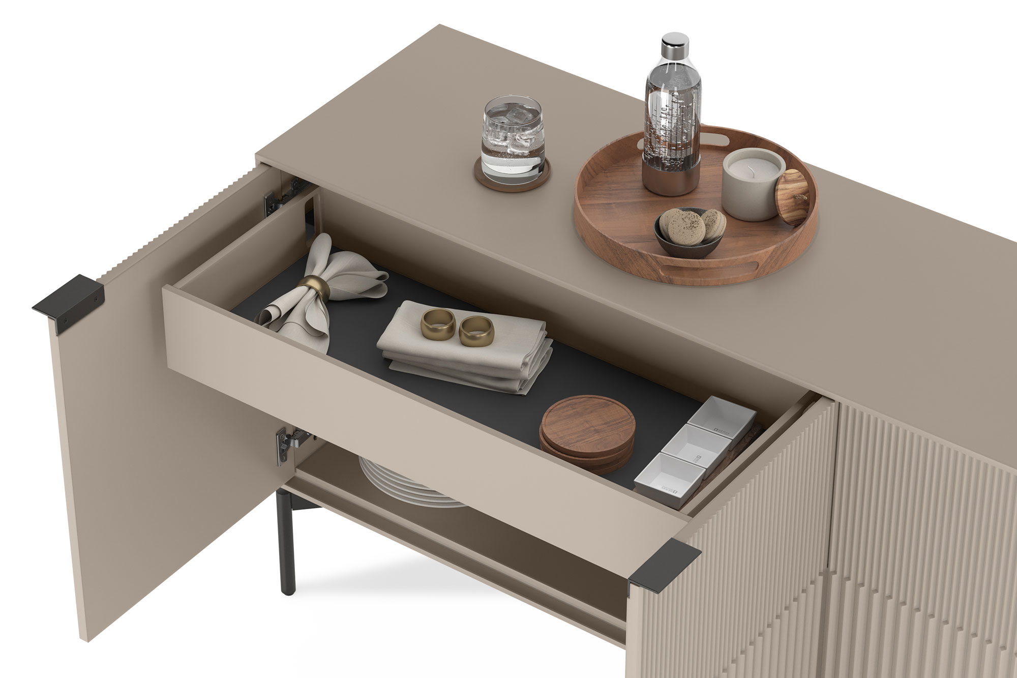 Beautiful lacquered cabinet finish Carved doors conceal storage areas 2 storage drawers can be positioned in the top or bottom of the cabinet Removable felt drawer liner 2 interior adjustable shelves Wire management holes in the back Stocked in a Stone finish with Carbon legs Available in other finishes by special order 80" Length 18" Depth 34" Height