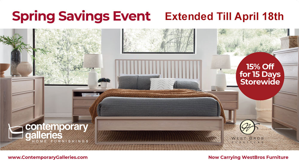 We Love Spring! We also Love Our Customers so we have decided to Extended our Spring Sale an additional 2 weeks. Savings of 15% Off Regular Prices Storewide except Everyday Value Items or Clearance Items. This 15% Discount is good on In-stock Items as well as Special Orders. We have just received many new products that are also on sale for this limited time and are now on our showroom as well as new brands like IMG Comfort and West Bros Furniture.
